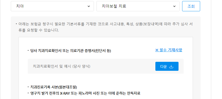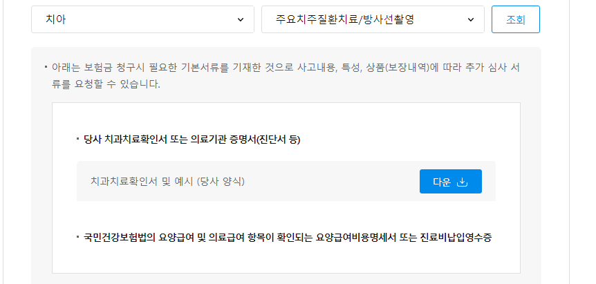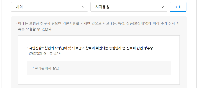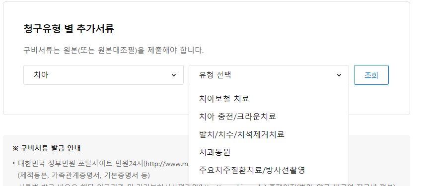 4. 치아 치료 유형별로 각기 다른 서류가 추가로 필요합니다. 치아를 선택한 후 유형을 선택하면 각 유형별로 필요한 서류를 볼 수 있습니다.