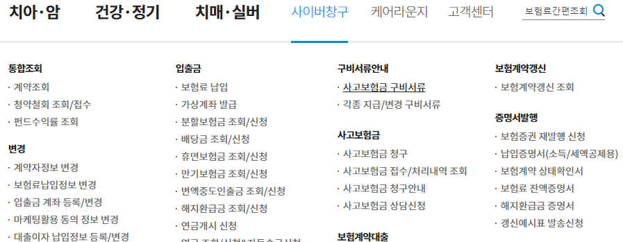 1. 라이나생명 홈페이지 메인화면 상단에 보이는 메뉴에서 사이버창구에 커서를 가져다 댄 후 구비서류안내 메뉴 아래에 있는 사고보험금 구비서류를 누릅니다.