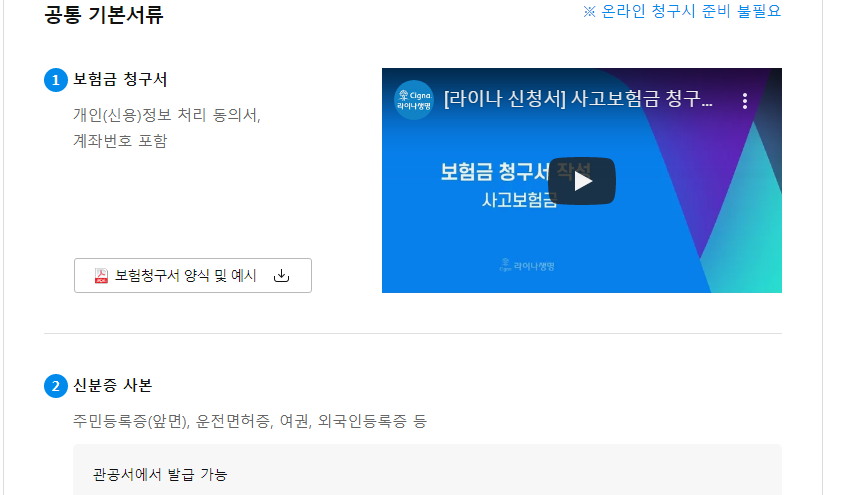 2. 라이나생명 치아보험 청구서류에 대한 설명을 볼 수 있습니다. 공통 기본서류부터 보입니다. 공통적으로 보험금청구서와 신분증 사본이 필요합니다. 주민등록증, 운전면허증, 여권 중 하나를 사용할 수 있습니다. 외국인이면 외국인등록증을 쓰면 됩니다.