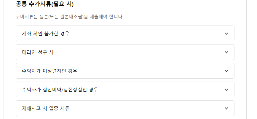 3. 필요시 추가서류가 필요합니다. 계좌확인이 불가한 경우는 통장사본, 대리인 청구시는 위임장, 수익자가 미성년자라면 기본증명서, 가족관계증명서 및 친권자의 변제의무확인서가 필요합니다. 수익자가 심신미약/심신상실인 경우는 후견등기사항증명서, 재해사고시에는 이에 대한 각종 증명서가 필요합니다.