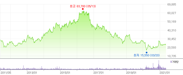 2016년 5월 고점을 찍은 후 급락하여 거의 5년 내내 하락해왔습니다. 2020년 3월 코로나 유행시작때 저점을 찍은 후 반등했다가 다시 지지부진합니다. 특별한 모멘텀이 없는 한 현재와 같은 상태가 앞으로도 지속될 것으로 전망됩니다.