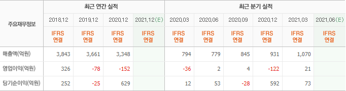 2018년 피크를 찍고 계속해서 실적이 감소 중입니다. 매출이 줄어들고 영업이익도 적자폭이 커지고 있습니다. 2020년 당기순이익은 아주 좋은데, 이것은 사옥매각으로 인한 일시적인 수익입니다.