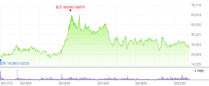 전국 각지의 편의점 및 수퍼로부터 꾸준한 매출이 발생하고 있습니다. GS리테일 주가 실적 배당금 전망 알아보겠습니다. GS리테일 주가 전망 보겠습니다. 아래는 지난 10년 동안의 GS리테일 주가 흐름을 보여주는 그래프입니다.