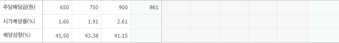 주당 배당금은 빠른 속도로 증가하고 있습니다. 당기순이익의 증가에 비례하여 주당 배당금도 증가를 했습니다. 다만 매출증가 없는 순이익의 증가는 한계가 있는 만큼 현재 수준에서 주당 배당금이 유지될 것으로 전망됩니다.
